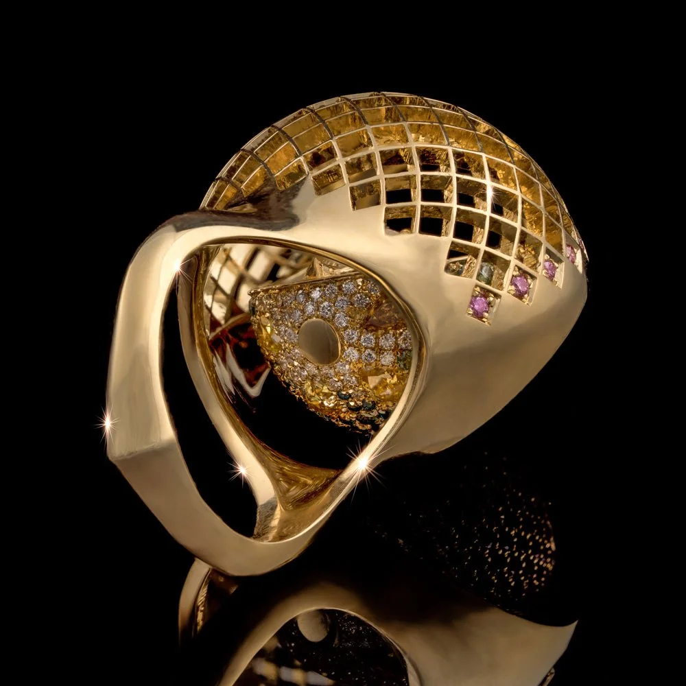 ‘I cradled the pearl at the centre of a spherical, undulating ring in pure gold, its surface carved with hundreds of tiny apertures and set with sapphires and diamonds. Around it, a second, more delicate outer layer forms a filigree structure, also set with diamonds in a criss-cross pattern. And beneath the pearl, I left a cross-section open, inviting you to look inside — to glimpse the hidden architecture of this little world and the detail that lies within.'