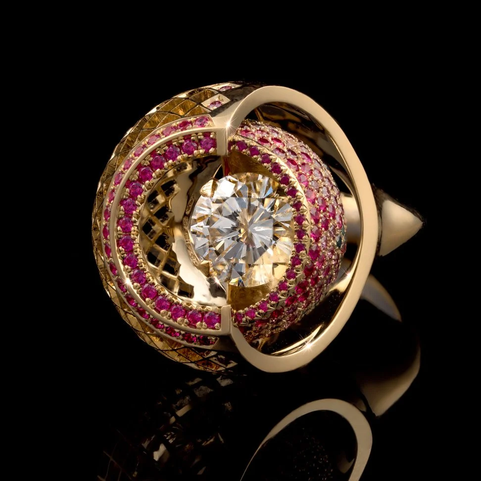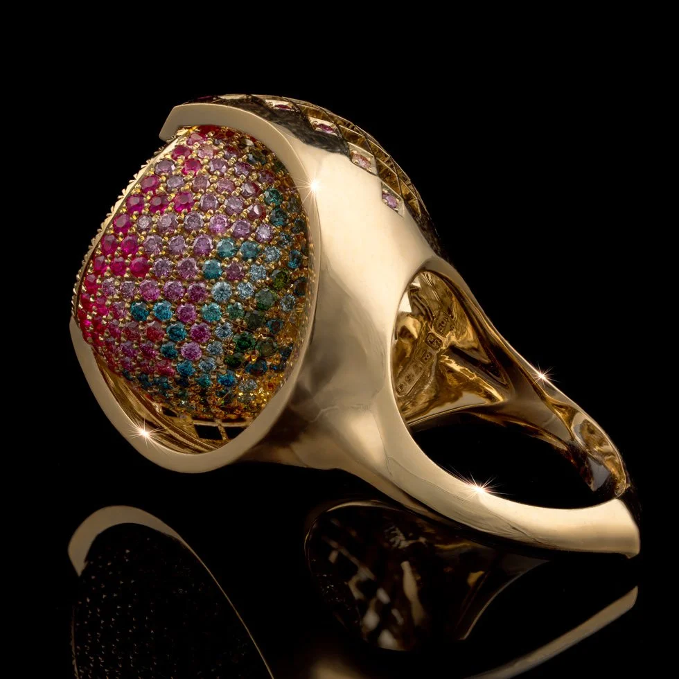 A technical description? The Orb is set with a central 14mm golden South Sea pearl and set in one 18KT rose gold ring accompanied by three hundred and eighty 1.1mm pavé set brilliant cut pink sapphires, orange sapphires, pink diamonds, green diamonds and blue diamonds for a total accompanying gemstone carat weight of 2.28cts.